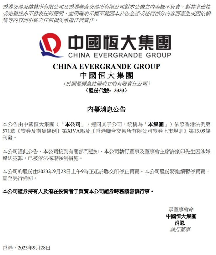 中国恒大在港交所公告,本公司接到有关部门通知,公司执行董事及董事会主席许家印先生因涉嫌违法犯罪,已被依法采取强制措施。