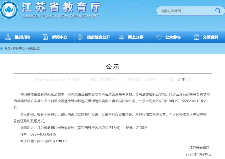 按照高校设置有关规定及要求,现将拟设立省属公办专科层次普通高等学校江苏司法警官职业学院、以连云港师范高等专科学校为基础拟设立市属公办本科层次普通高等学校连云港师范学院两个事项向社会公示。公示时间为2023年10月19日至2023年10月25日。