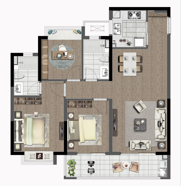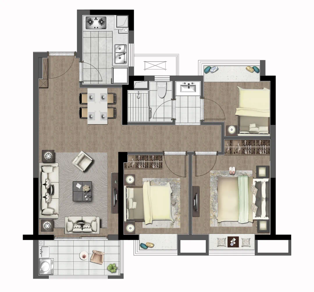 项目突破了传统户型空间局限,在建面约89—142㎡的空间内精研当代人所需,采用大面宽、薄进深的设计增大光照范围,绝大多数户型南向宽景大阳台。