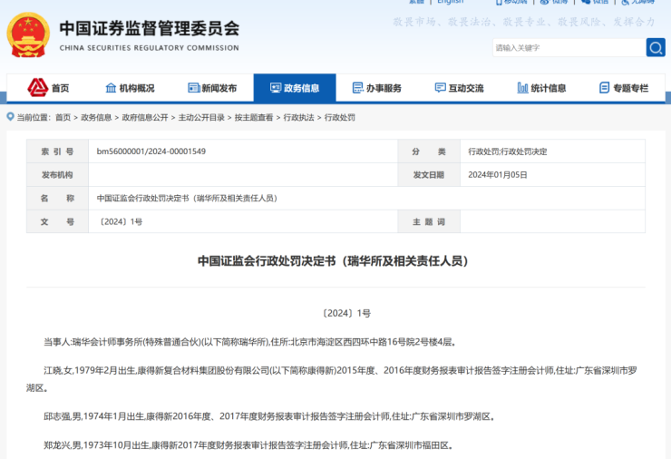 近日,中国证监会官网刊登了2024年第一份行政处罚决定书,主要涉及瑞华会计师事务所(简称瑞华所)及相关责任人员。瑞华所因为康得新财务造假事件被罚没1783万元。