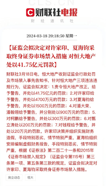 3月18日,恒大地产集团有限公司发布关于收到中国证监会行政处罚及市场禁入事先告知书的公告。其中指出,针对恒大地产披露2019年、2020年年报存在虚假记载的违法行为,依据《证券法》第一百九十七条第二款的规定:1.责令恒大地产改正,给予警告,并处以1,000万元的罚款;2.对许家印给予警告,并处以500万元的罚款;作为实际控制人组织、指使上述行为,处以1,000万元的罚款;3.对夏海钧给予警告,并处以500万元的罚款;4.对潘大荣、潘翰翎给予警告,并分别处以300万元的罚款;5.对柯鹏给予警告,并处以100万元的罚款;6.对钱程给予警告。