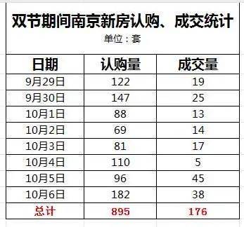 据南京网上房地产数据,今年中秋国庆假期(9.29-10.6),新房认购了895套,成交176套。