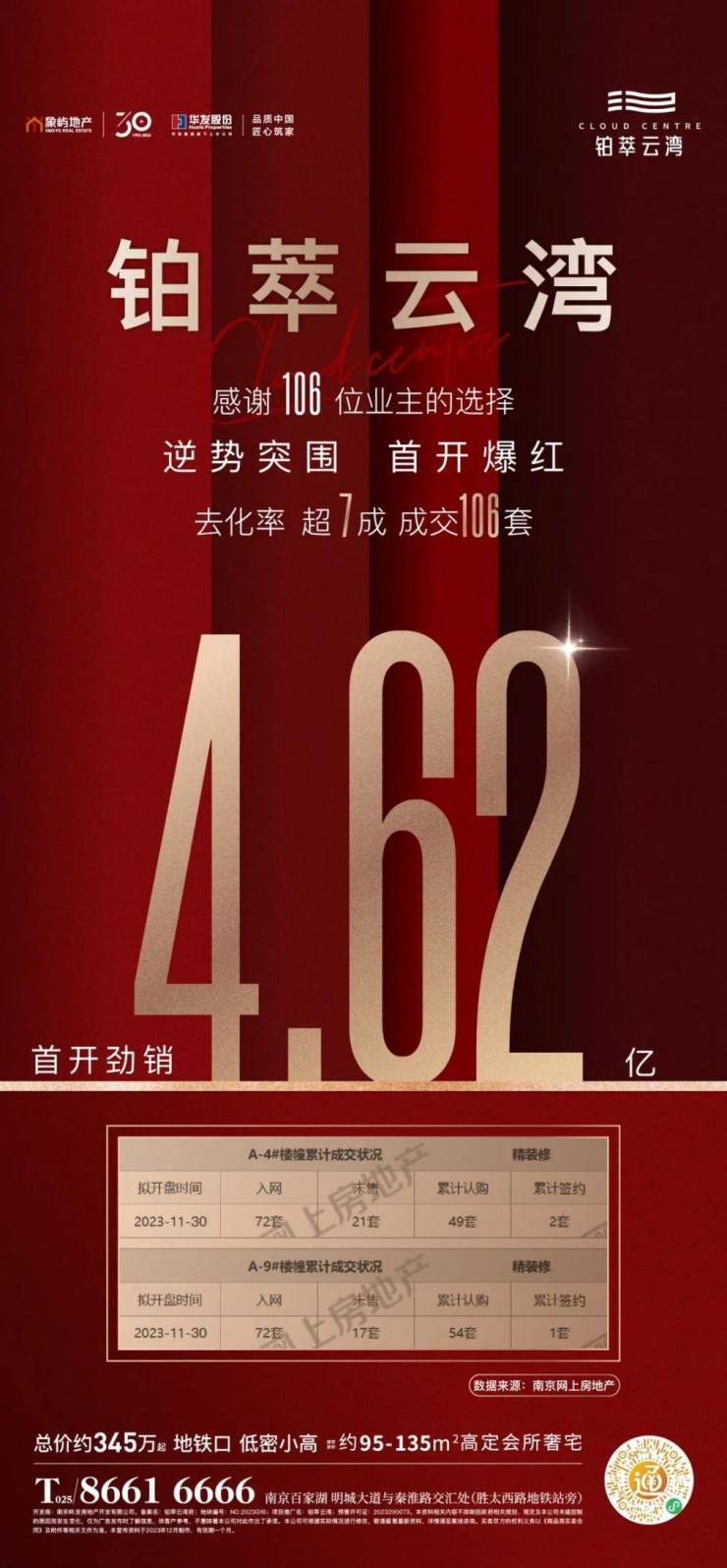 成交106套,去化超7成、劲销4.62亿的首开成绩,便是给予市场期待的最好回答(数据来源:南京网上房地产)。铂萃云湾用现象级热销说明,当下,足够优秀的产品,才是穿越周期的制胜法宝。
