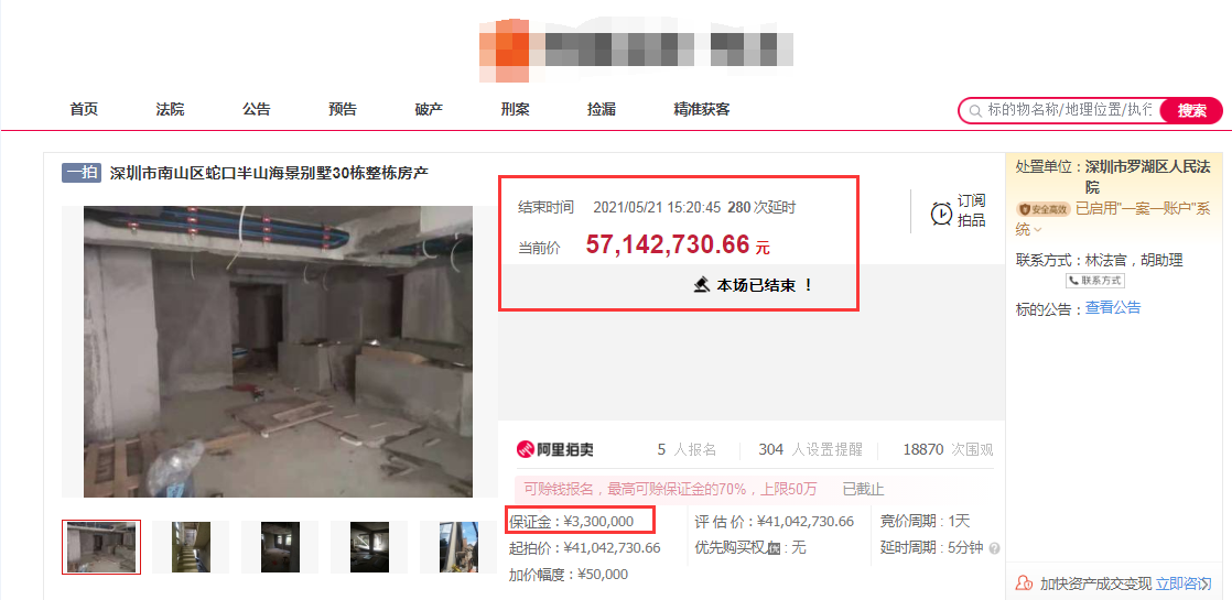 就在2021年5月20日至5月21日,广东省深圳市罗湖区人民法院在拍卖平台上对深圳市南山区蛇口半山海景别墅30栋整栋房产进行拍卖,起拍价4104.273066万元,共有5人各自缴纳保证金330万元报名,经过283次出价,最终成交价5714.273066万元,增值幅度逾39.22%。按成交价测算,该别墅建面折合每平方米18万元。