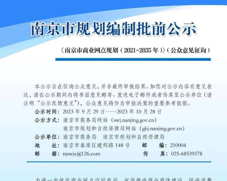 为进一步优化商业网点空间布局,有序推进商业载体建设,促进消费提质升级,提升城市商业集聚力和影响力,着力打造国际消费中心城市市商务局、市规划和自然资源局组织编制本次《南京市商业网点规划(2021-2035年)》