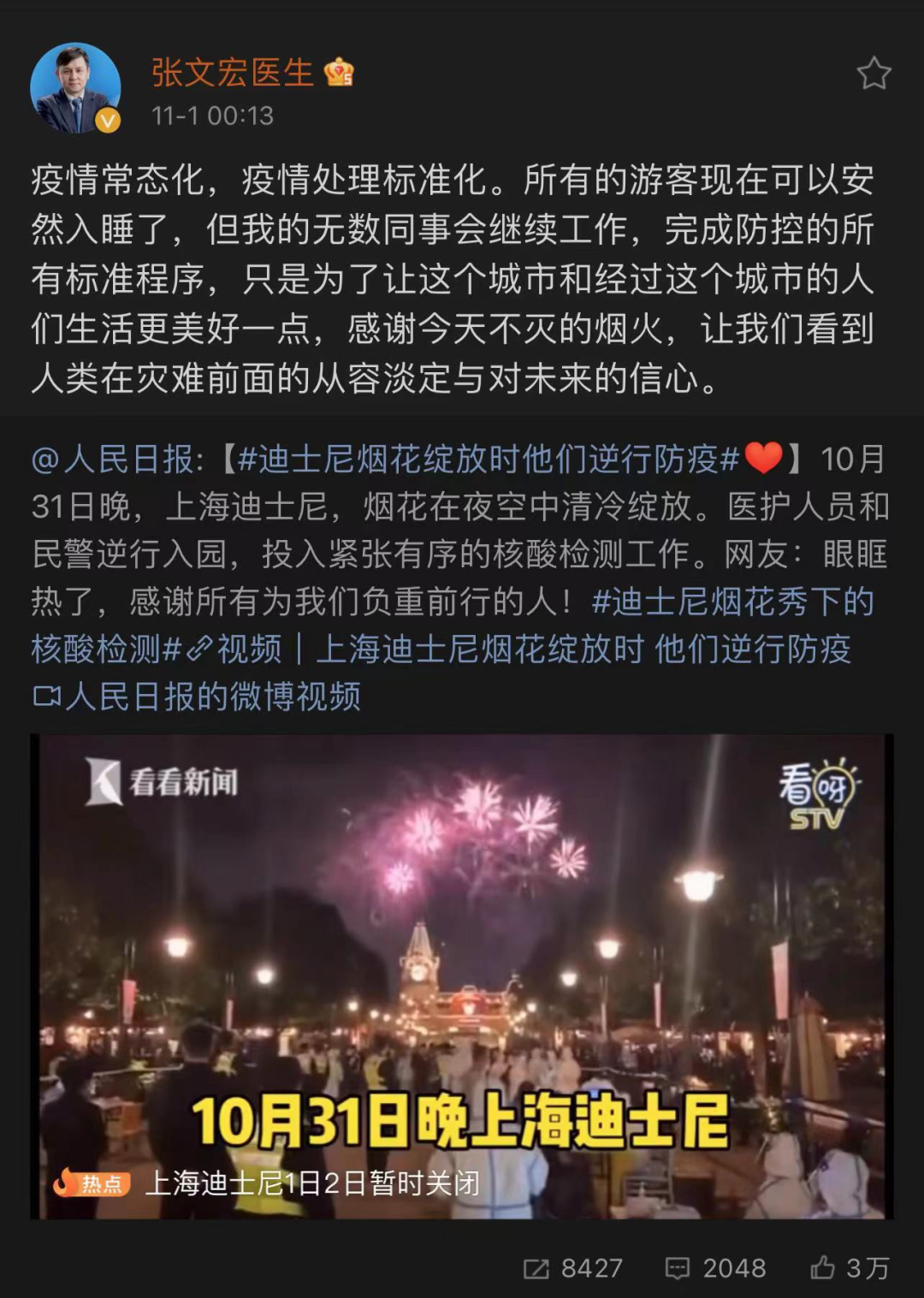 11月1日凌晨,针对10月31日晚间被热议的上海迪士尼相关防疫工作,上海复旦大学附属华山医院感染科主任张文宏通过个人微博发声。