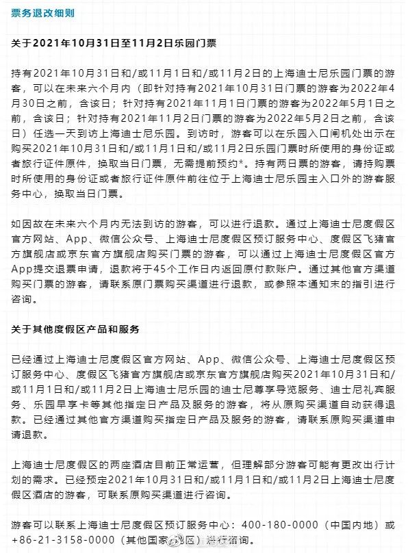 10月31日晚间,@上海发布发布消息称,迪士尼度假区表示,根据疫情防控要求,上海迪士尼乐园和迪士尼小镇将于2021年11月1日和2日(周一和周二)暂时关闭。恢复运营时间一旦明确,将及时告知。 对于在此期间受到影响的各位游客,度假区制订了相关票务的退改细则。