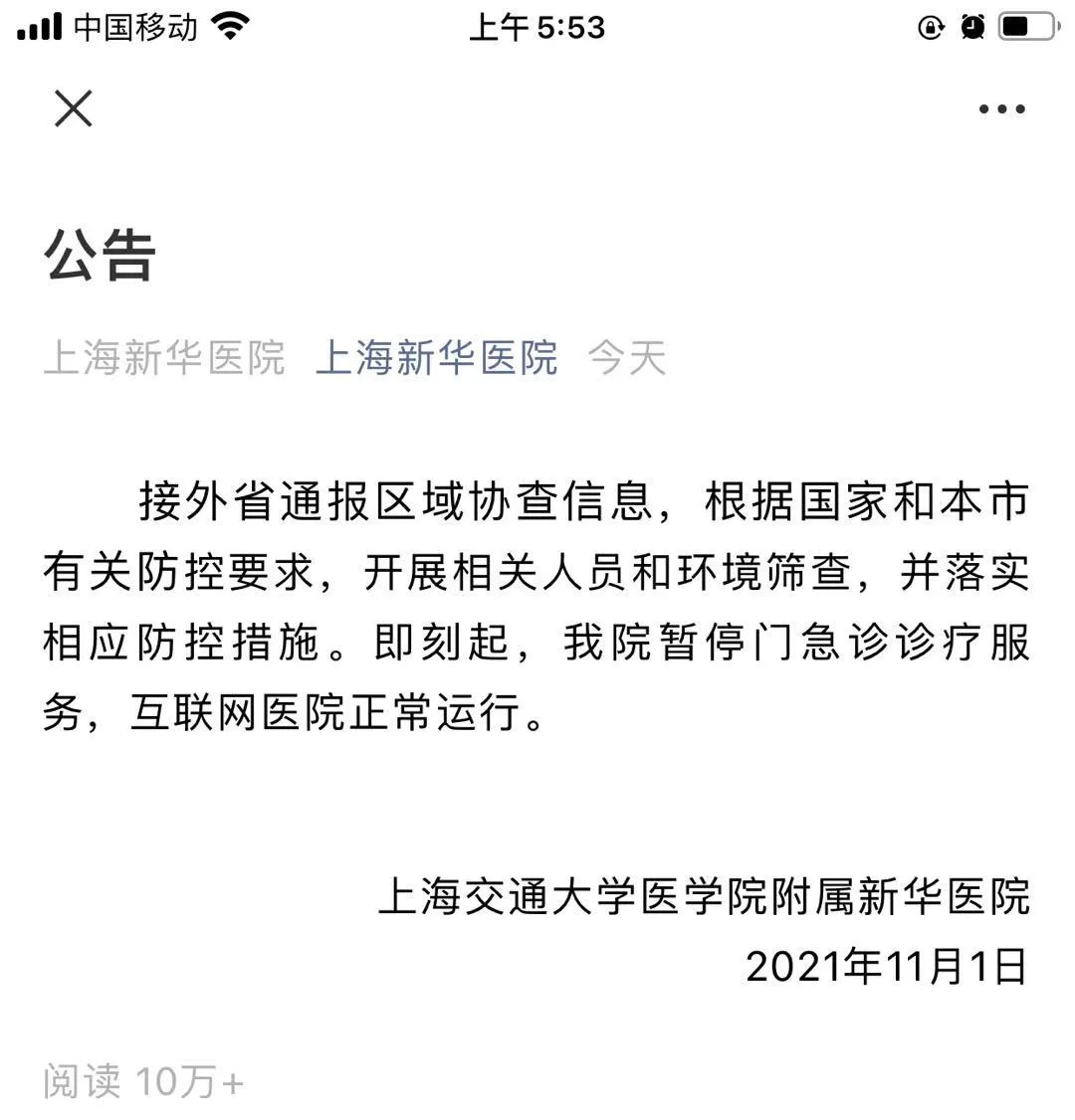 此外,“上海新华医院”微信号11月1日凌晨信息显示,上海交通大学医学院附属新华医院发布公告,接外省通报区域协查信息,根据国家和本市有关防控要求,开展相关人员和环境筛查,并落实相应防控措施。即刻起,我院暂停门急诊诊疗服务,互联网医院正常运行。