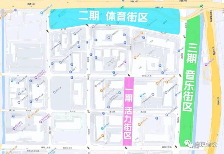 与前两期相比,三期建设内容较为丰富,开街后将给市民带来全新体验。据承建单位南京建工集团项目负责人介绍,三期总面积约2.5万平方米,包括新建四栋商业建筑及消防设施、景观绿化、南河风光带景观提升、街区路面改造、新增停车场等。