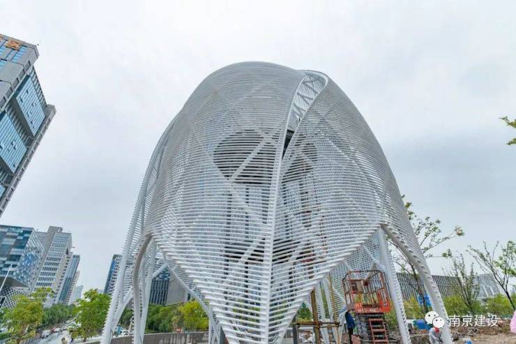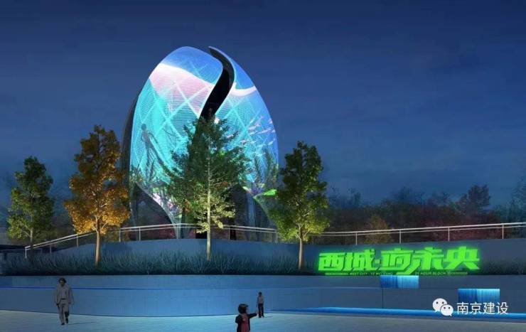 据了解,这座雕塑名叫《凤巢》,以双曲面造型围合而成,利用高科技手段,能使曲面形态上呈现出动态画面。曲面屏幕后期还可以播放视频素材,形成街区里一座通透璀璨的标志建筑。