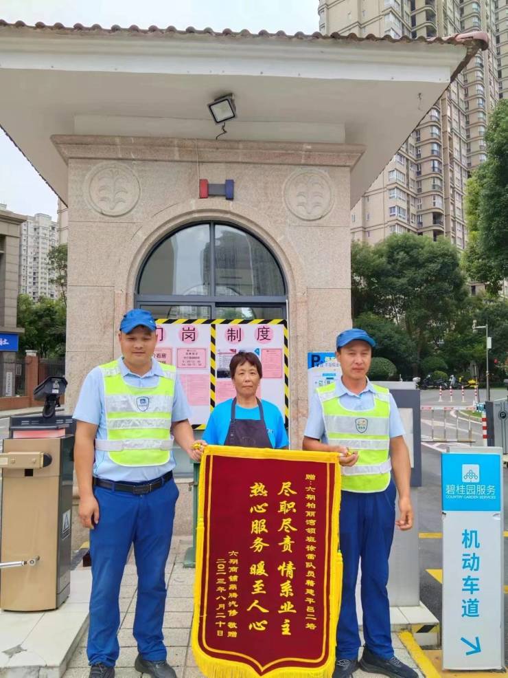 大人赶到门岗时还不忘感谢柏丽湾的队员,后来还专门送来一面锦旗,为尽职尽责的物业工作点赞。