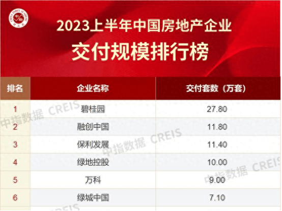 据亿翰智库发布的报告显示,头部企业仍是“保交楼”的主力。中指研究院此前发布的《2023上半年中国房地产企业交付规模排行榜》显示,今年上半年,有4家企业交付套数超十万套,其中碧桂园位居榜首,接近第二、三、四名交付量的总和。截至2023年9月15日,碧桂园累计交付房屋共38.1万套,累计交付面积约4686万㎡,交付项目涉及到31个省份、231个城市,部分项目实现提前交付。