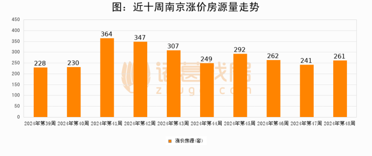 从调价房源来看,第48周南京涨价房源261套,较上周上涨8.3%。与此同时,48周涨价房源占比提升0.34个百分点,业主信心持续恢复。