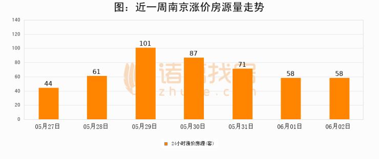 根据诸葛找房数据显示,南京24小时涨价房源量为58套,较06月01日持平。