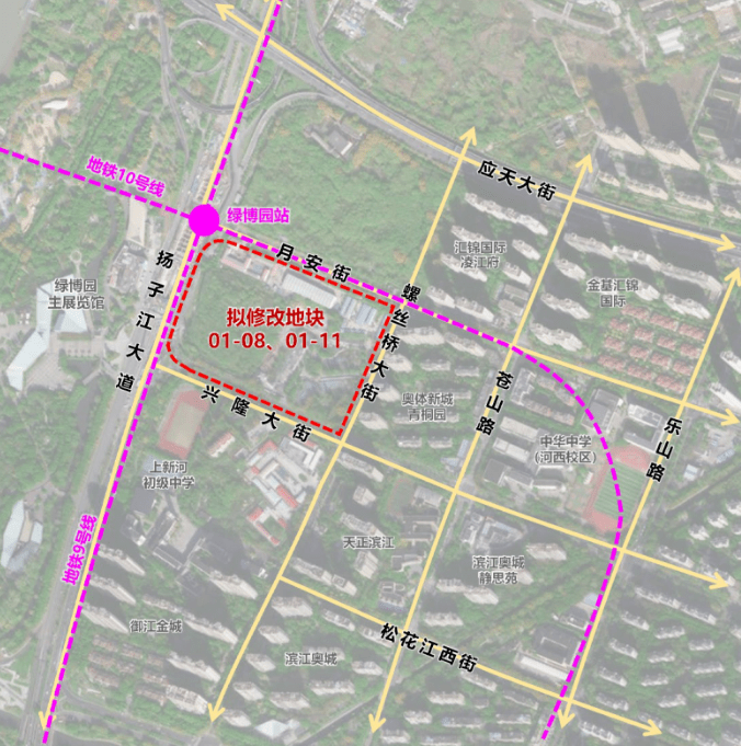 拟变更地块位置非常好,紧靠地铁10号线绿博园站,地块西侧为绿博园,南侧为上新河初级中学,东侧为奥体新城青桐园,北侧为空地,现状主要为临时施工场地和空地。