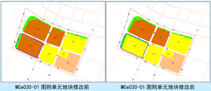 本次规划修改后 MCe030-01-08 地块为 R2 二类居住用地,用地面积为7.21 公顷,容积率<2.2,建筑密度<25%,控制高度≤80m,其余指标不变;MCe030-01-11 地块公园绿地用地面积为 1.17 公顷,其余指标不变。