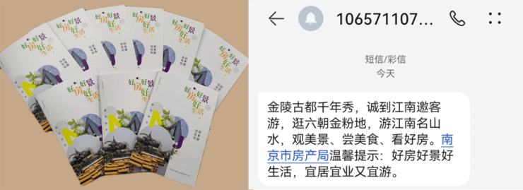 通过线上发布“房产+文旅”主题宣传视频、向来宁游客发送主题短信,线下开展“好景、好房、好生活”宣传画册进酒店、入景区、驻展会,全方位展示南京宜居、宜业、宜游的城市风范和深厚的文化底蕴。