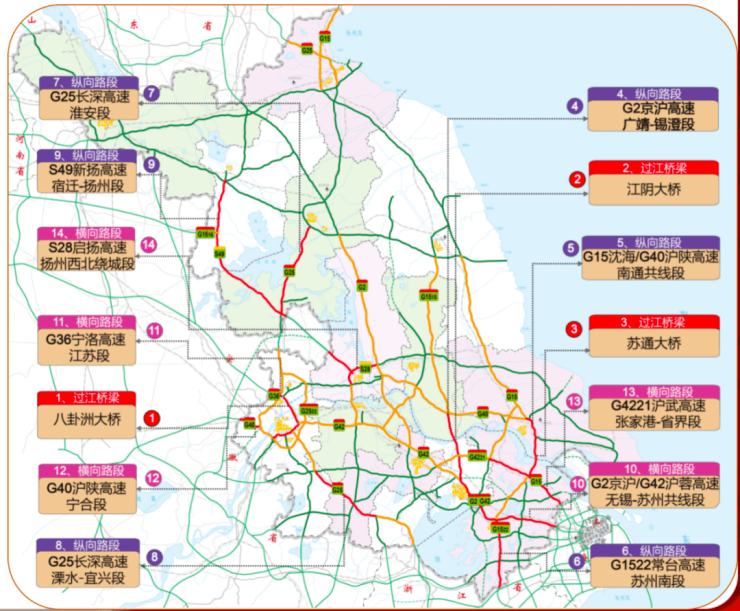 由北往南方向:江阴大桥、苏通大桥,G2京沪高速宝应、广靖段,G25长深高速灌南段,G15沈海高速大丰、南通、苏州段,G1515盐靖高速泰兴段,S49新扬高速扬州、盱眙段。