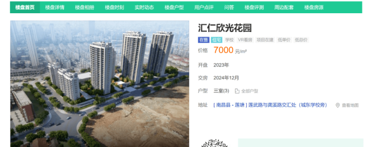 据安居客显示,汇仁欣光花园于2023年开盘,交房时间2024奶奶12月,目前参考价格为7000元/m2。