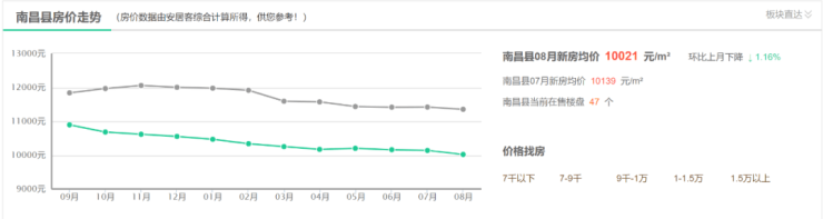 另外,安居客显示,南昌县当前在售楼盘47个,8月新房均价10021元/m2,环比上月下降1.16%。